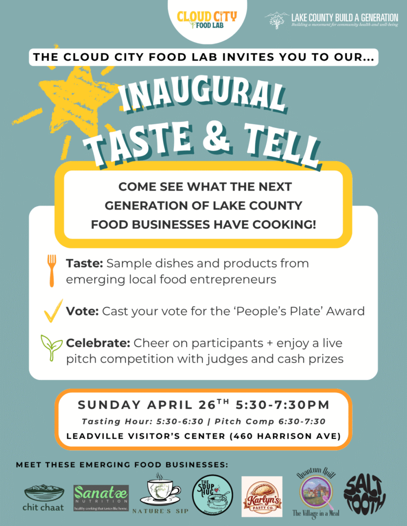 Leadville Visitor’s Center 460 Harrison Ave, Leadville, ColoradoThe LCBAG Food Access Coalition invites you to our ingagural "Taste n' Tell" event on April 26th! Come see what the next generation of lake county food businesses have cooking! Taste: Sample dishes and products from emerging local food entrepreneurs Vote: Cast your vote for the ‘People’s Plate’ Award Celebrate: Cheer on participants + enjoy […]